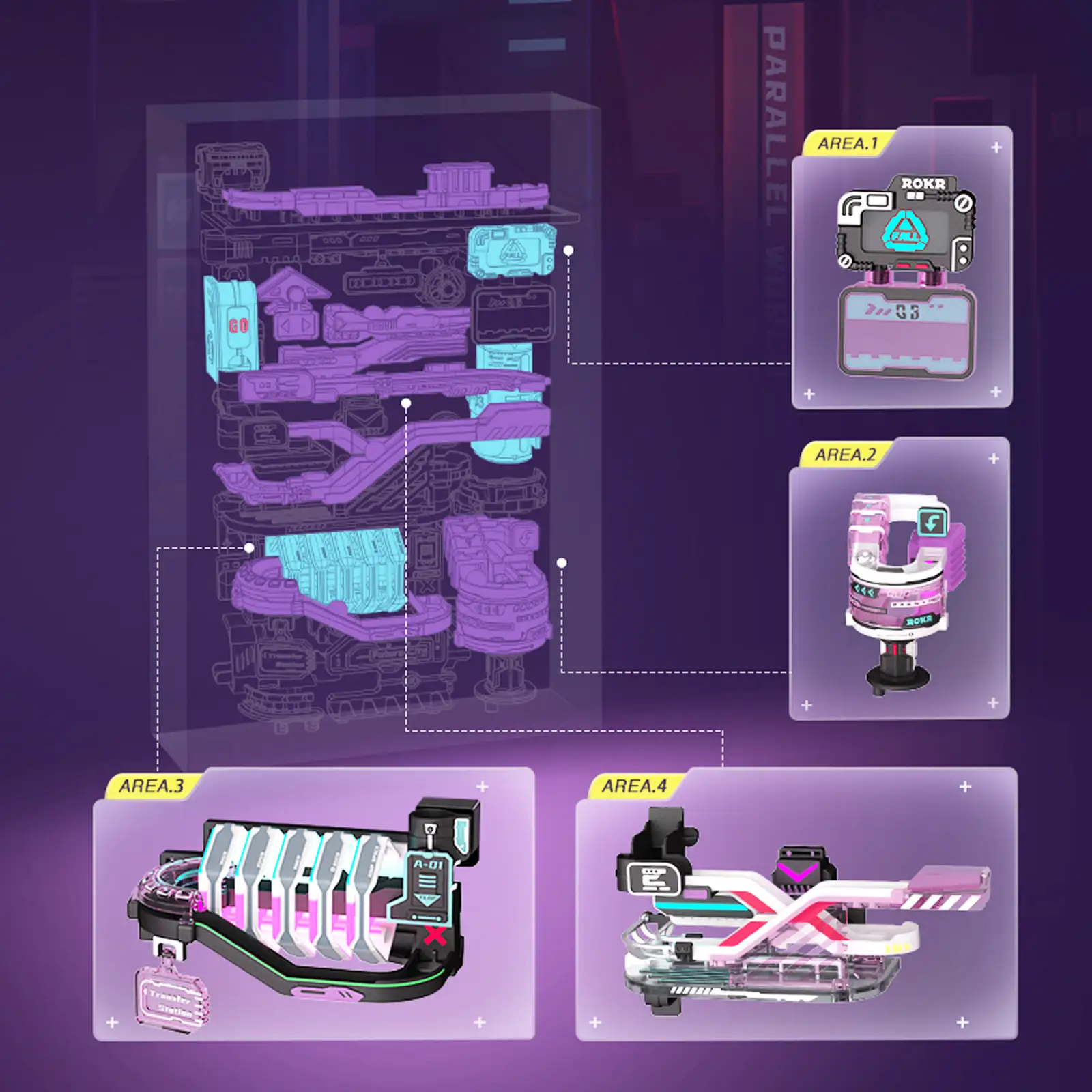 Это миниатюрная 3D-головоломка с беговой дорожкой в стиле киберпанка, с общей длиной дорожки около 174 см. Когда шарики брошены в отверстие, он перемещается по городу, катясь сверху вниз под действием силы тяжести, а затем поднимается на лифте наверх и повторяет весь процесс.