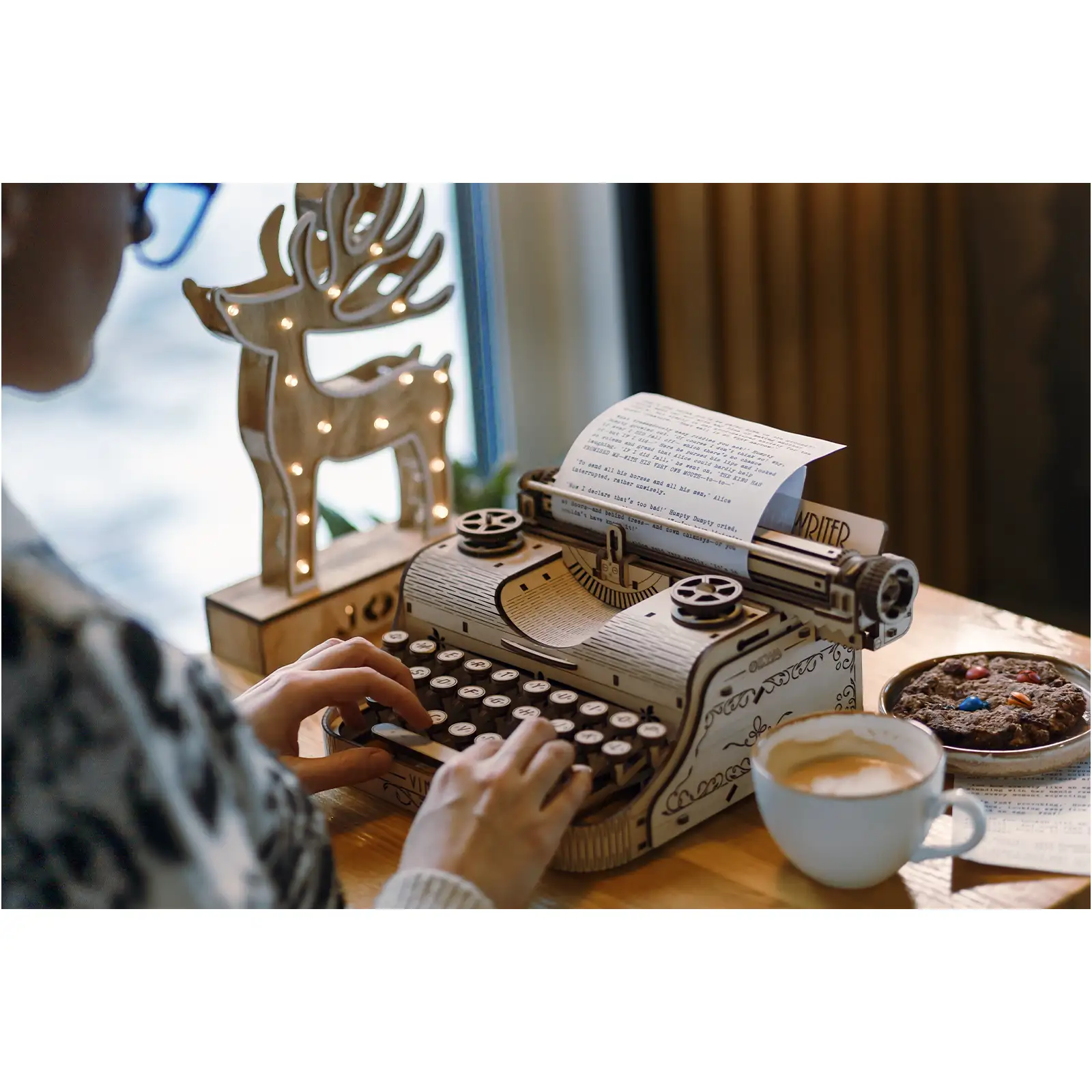 Механический деревянный 3D-пазл «Печатная машинка», девушка печатает, рядом на столе кофе и печенье