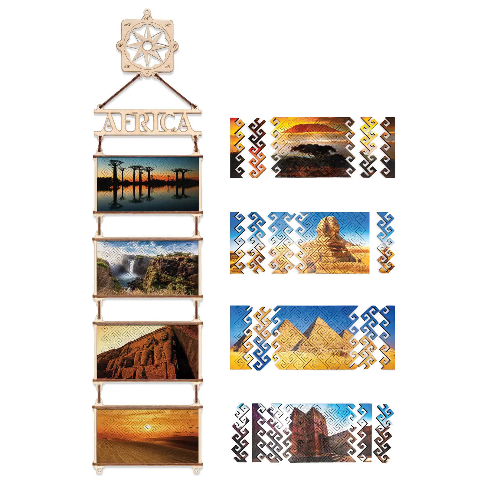 В наборе содержатся пазлы из натурального дерева, на каждом из которых изображены знаменитые места различных континентов.